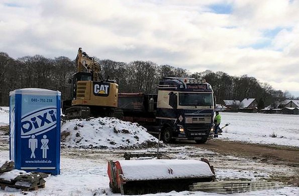 Die ersten Bauarbeiten haben begonnen. Am Südrand des Geländes wird die Baustraße zum Bau des Rückhaltebeckens angelegt. Der Schnee taut langsam weg, so dass den weiteren Maßnahmen auch das Wetter nicht mehr im Wege steht.