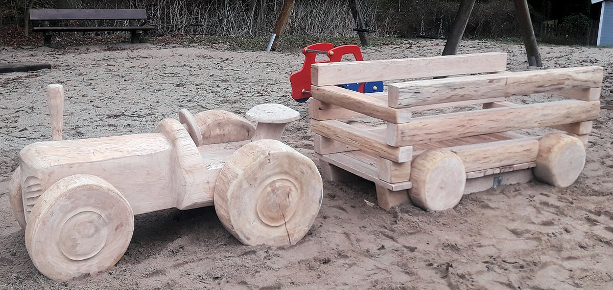 Nachdem der Holztrecker auf dem Spielplatz an der Waldschule wegen Verrottung abgebaut werden musste, haben uns viele Eltern gebeten, doch Ersatz zu schaffen. Nach langem Suchen sind wir bei einer Firma in Thüringen fündig geworden. Nun ist er wieder da, der geliebte Trecker. Wir wünschen den Kindern viel Spaß beim Gasgeben oder Klettern im anhängenden Wagen.