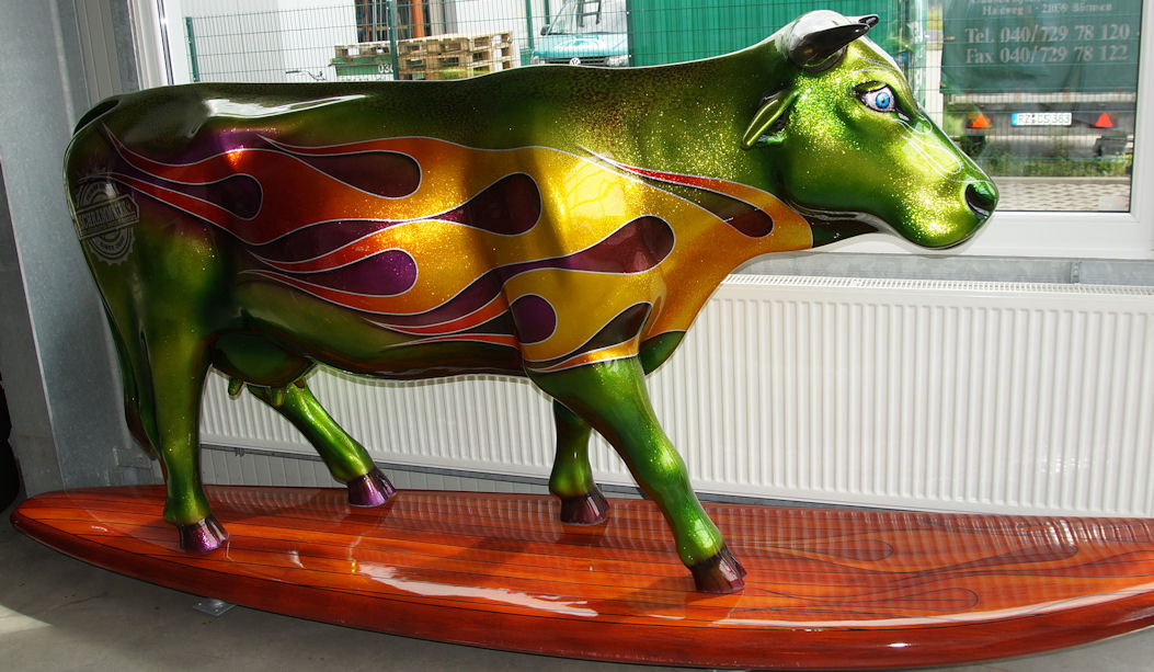 Bisher blühten auf dem Kreisel an der B207 vorwiegend Blumen, doch bald könnte dort ein Kunstwerk stehen. Schon seit längerem wurde im Umweltausschuss diskutiert, ob in der Mitte nicht eine Plastikkuh aufgestellt werden könnte, die vom Schrammwerk künstlerisch gestaltet wurde. Jetzt hat die CDU den Wunsch über die Presse in die Öffentlichkeit getragen. Auf eine Frage beim Amt wegen möglicher rechtlicher Bedenken erhielt die Gemeinde u.a. folgende Antwort: Gegen die Aufstellung bestünden keine Bedenken, wenn keine Besuchergruppen angelockt bzw. Kinder zum Spielen animiert würden. Dies kann allerdings von der Gemeinde nicht verbindlich gewährleistet werden.