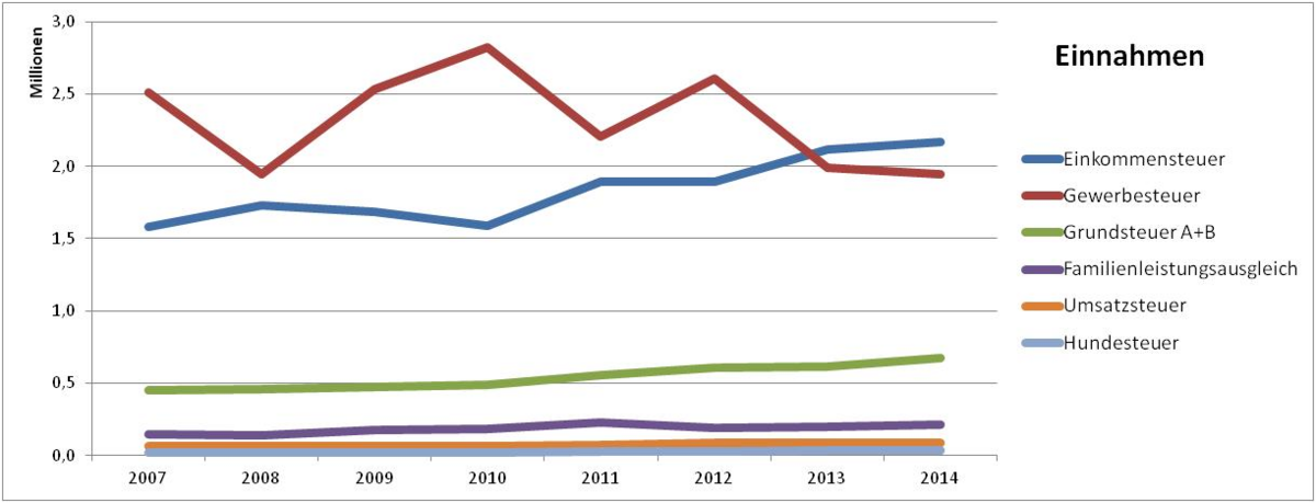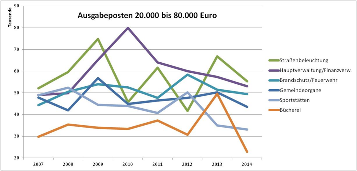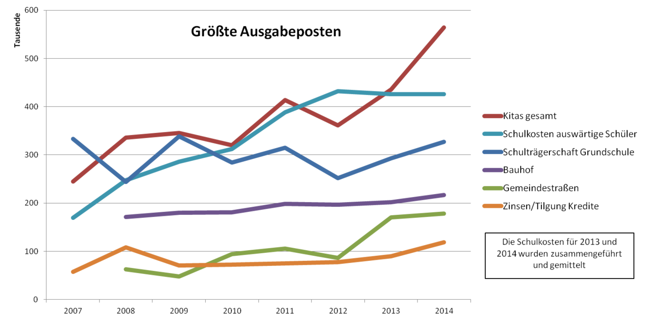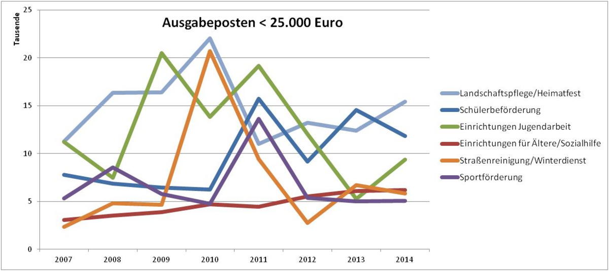Entwicklung einiger Ausgabe- und Einnahmeposten im Zeitraum 2007-2014. Zu erkennen ist, dass bei den mittleren und kleinen Posten die Ausgaben gesunken sind.