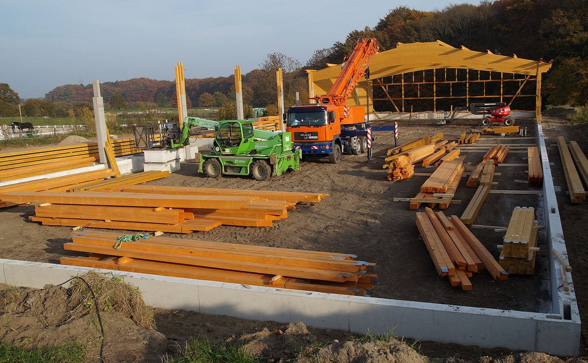 Von der Börnsener Straße aus gut zu erkennen: Der Fleederbogen, Zubringer der neuen Siedlung am Fleederkampredder, wird aufgesetzt. Die Bordsteine zum nördlichen Rand stehen.