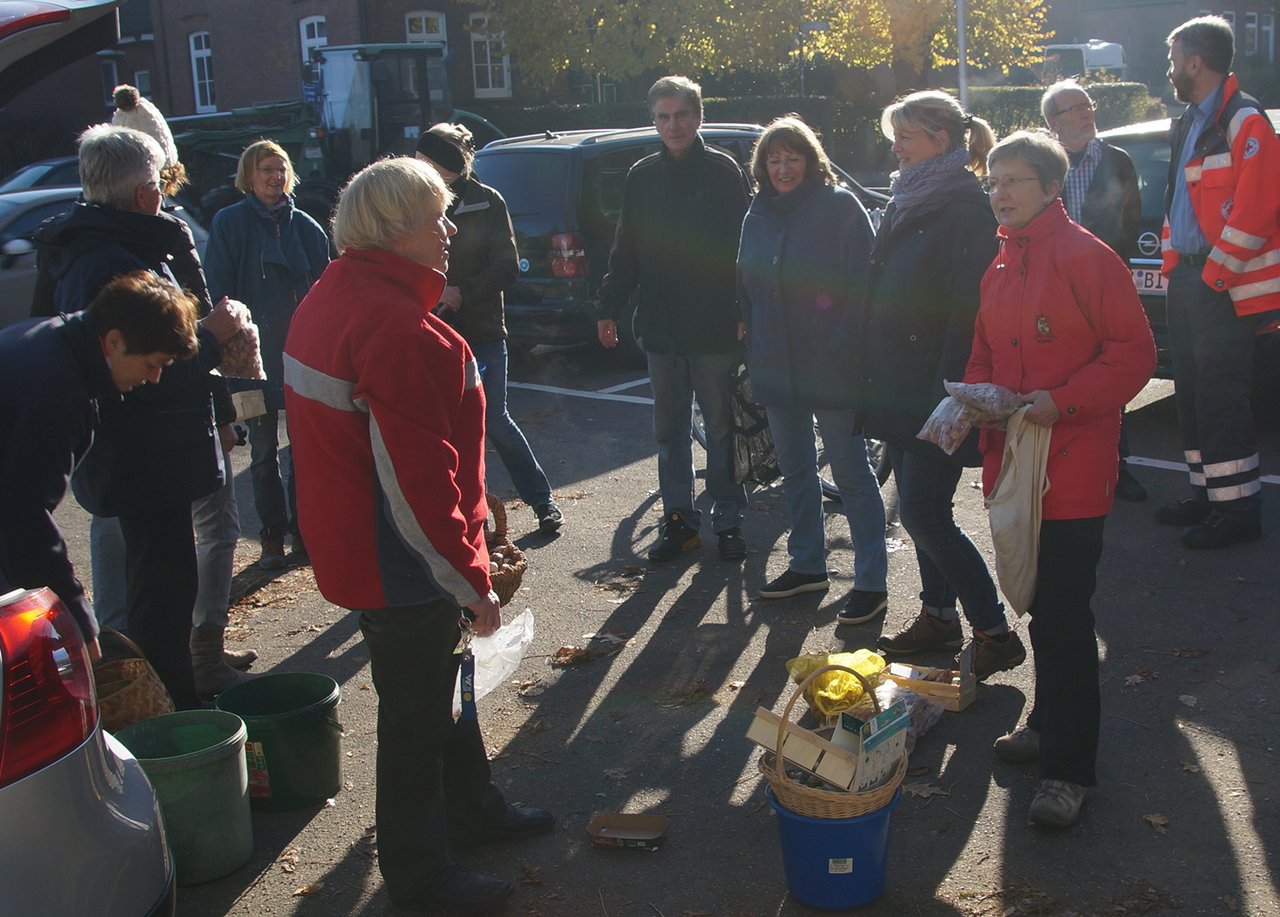 Das obere Bild zeigt die Akteure bei der Lagebesprechung. Das untere Bild zeigt einige Blumen- und Naturliebhaber auf der Baumscheibe unter einer der neu gepflanzten Linden an der Einfahrt Frachtweg.