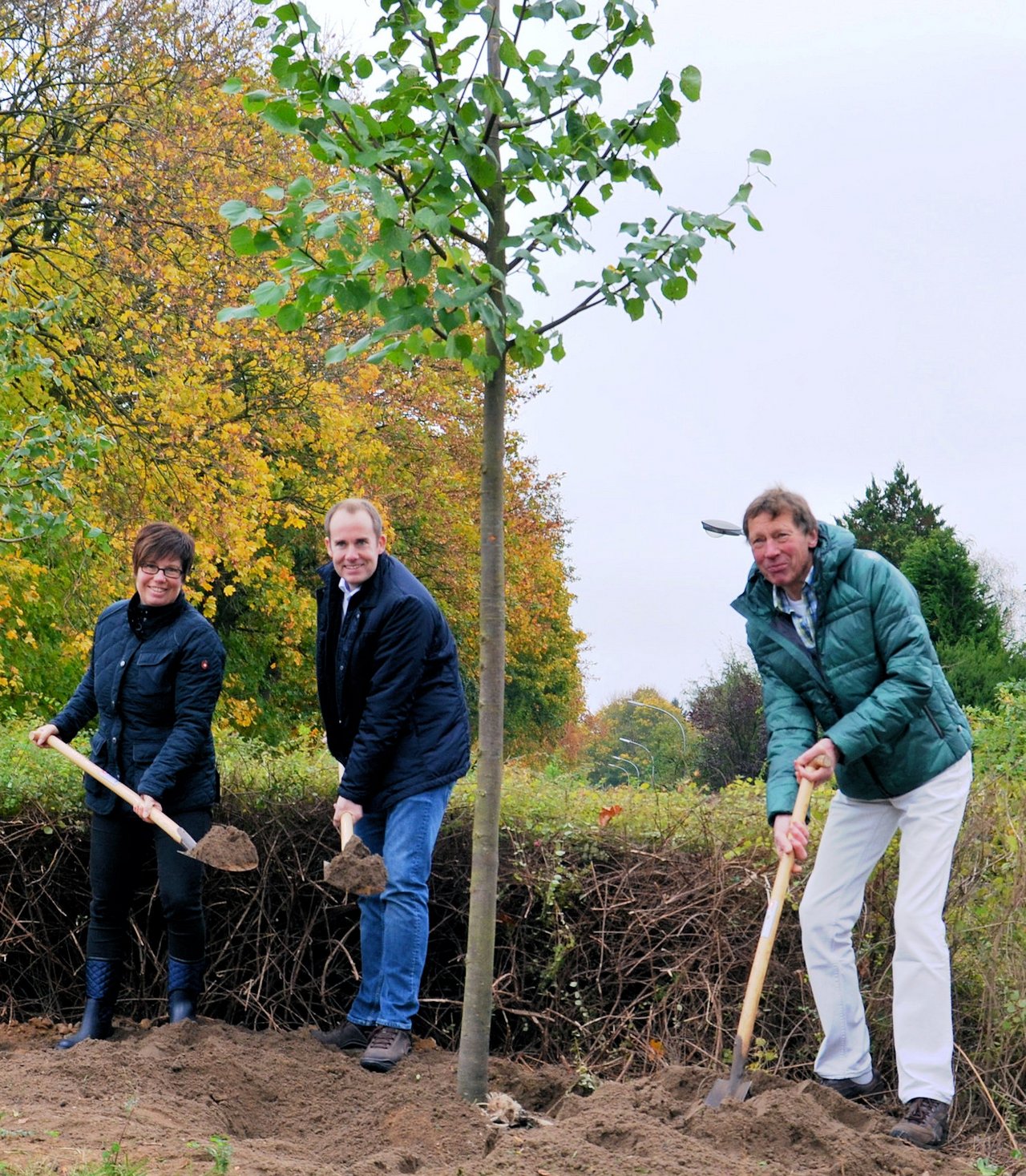 Das Foto zeigt die Amtsdirektorin Christina Lehmann als Repräsentantin des Amtes, Landrat Dr. Christoph Mager und Bürgermeister Klaus Tormählen bei der symbolischen Pflanzaktion. Die Beschaffung und das Setzen der Bäume wurde von der Gartenbaufirma Ehmcke umgesetzt (Foto: Frohnert, Kreis Hzgt. Lauenburg).