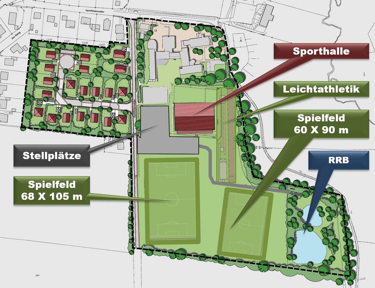 Das Sportgelände besteht aus Kunstrasenplatz, Leichtathletikanlagen (100 m, Weitsprung, Kugelstoß) und der Halle. Auf diesem Gelände ist noch Platz für eine Verfügungsfläche. Das Regenauffangbecken für die gesamte Anlage liegt am östlichen Rand. Direkt am Hamfelderedder ist Platz für ca. 120 Stellplätzen. Zwischen alter und neuer Halle befinden sich weitere Stellplätze für PKW und Fahrräder. Hier könnten auch ggf. Schulkinder aussteigen. Kunstrasen und Regenkbecken sollen nach Erlangen der Rechtskraft möglichst sofort errichtet werden. Baubeginn wäre dann im Frühjahr 2020. Der Hallenbau ist für 2022 vorgesehen.