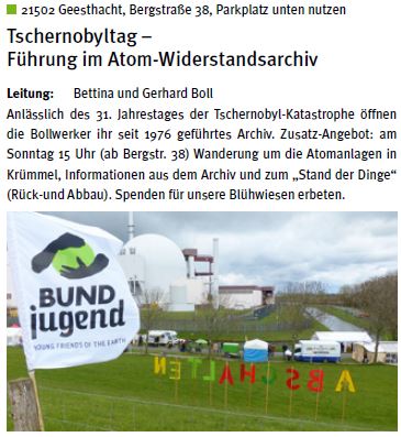 Zusatz-Angebot des BUND: am Sonntag 15 Uhr (ab Bergstr. 38) Wanderung um die Atomanlagen in Krümmel, Informationen aus dem Archiv und zum „Stand der Dinge“ (Rück-und Abbau).