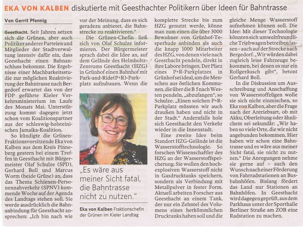 Am 27. Februar 2019 besuchte unsere unsere Fraktionsvorsitzende im Kieler Landag, Eka von Kalben, Geesthacht und diskutierte mit dem Bürgermeister Olaf Schulze sowie den grünen Fraktionsmitgliedern Gerhard Boll und Marcus Worm die Möglichkeiten zur Reaktivierung der Bahnstrecke Richtung Hamburg.