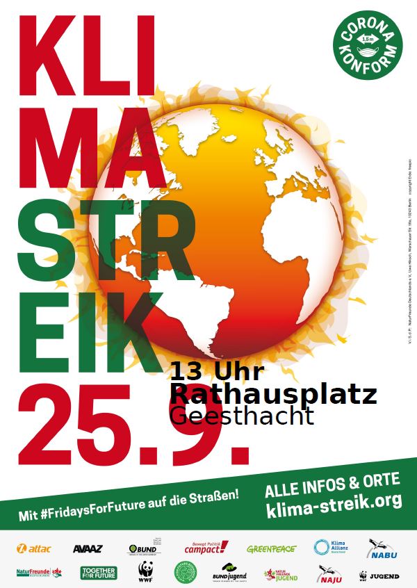 Komm auch du zum globalen Klimastreik am 25. September 13 Uhr in Geesthacht vor dem Rathaus – natürlich Corona-konform: mit 1,5 m Abstand und Alltagsmaske.