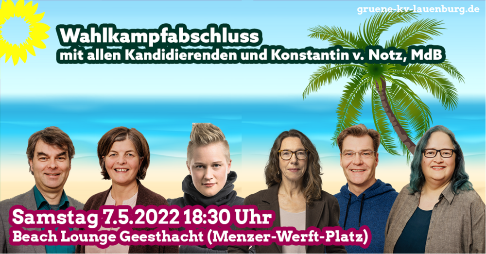Am Samstagabend, den 7.Mai ab 18:30 Uhr laden wir zu Live-Musik und Gesprächen in die Beachlounge (Geesthacht, Menzer-Werft-Platz) ein. Hier gibt es noch einmal die Gelegenheit, mit den Grünen Kandidierenden aus dem Kreis und MdB Konstantin von Notz ins Gespräch zu kommen, und bei Musik und einem Getränk den Abend mit Blick auf die Elbe zu genießen.