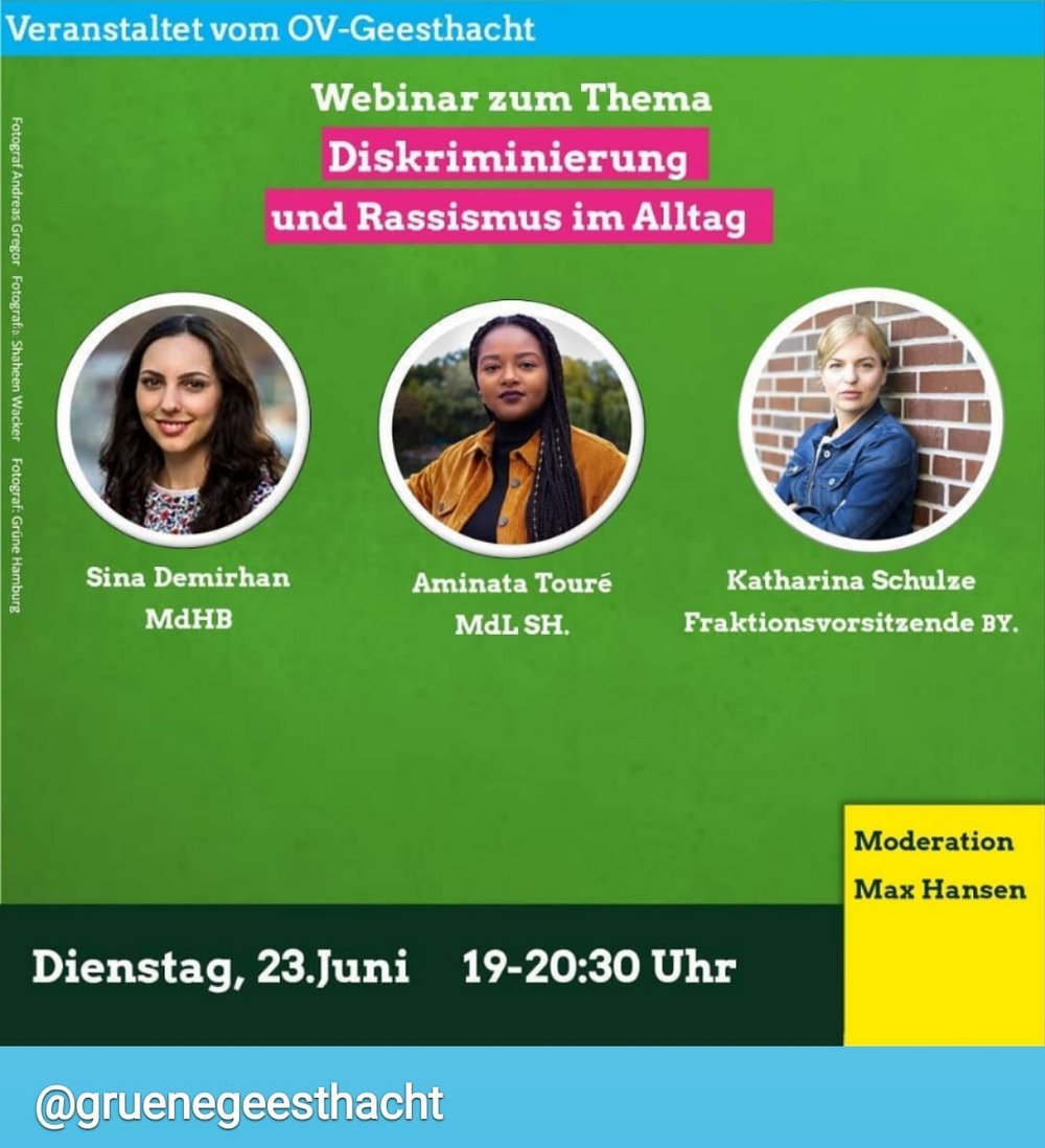 In einem Webinar wird der OV Geesthacht, BÜNDNIS 90/DIE GRÜNEN mit den Politiker*innen Aminata Touré (MdL, Vizepräsidentin im Landtag, SH), Sina Demirhan (MdHB) und Katharina Schulze (MdL, Fraktionsvorsitzende BY) über alltäglichen Rassismus in Deutschland reden.