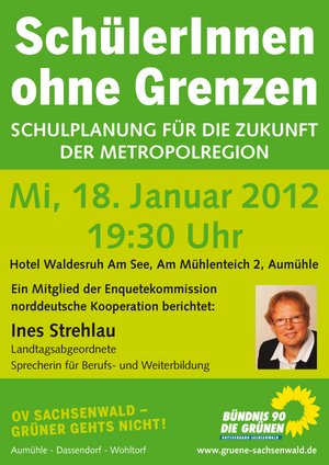 Der Ortsverband Sachsenwald von Bündnis 90/Die Grünen lädt herzlich ein zur Veranstaltung "Schülerinnen und Schüler ohne Grenzen" mit der Grünen Landtagsabgeordneten Ines Strehlau am Mittwoch, den 18. Januar um 19:30 Uhr ins Restaurant „Waldesruh am See“ in Aumühle, Am Mühlenteich 2.
