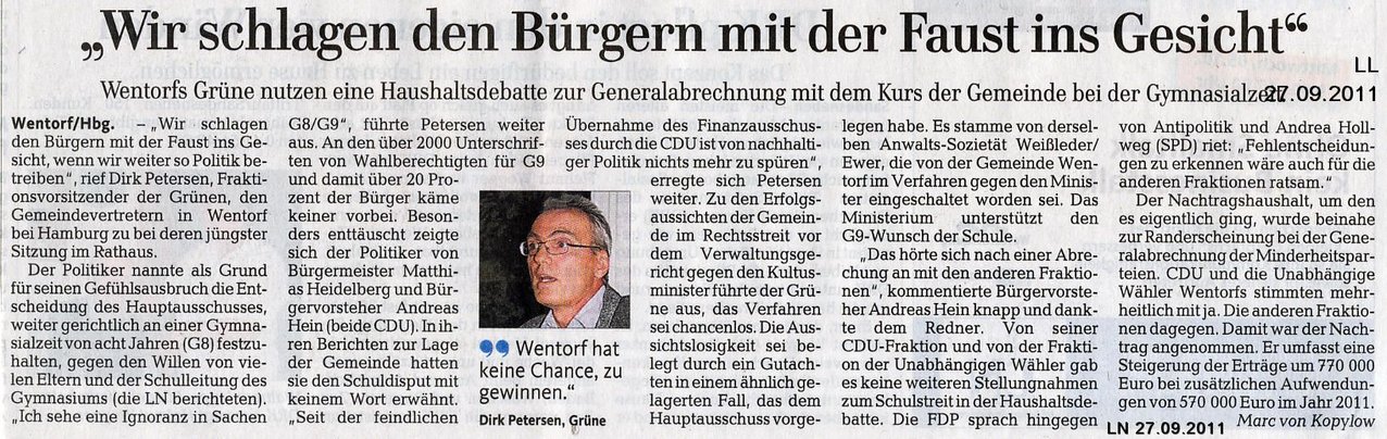 Der Vergleichsvorschlag des Gerichts, der nahezu identisch mit einem Vorschlag des Kultusministers war, ist damit vom Tisch. Der Minister hatte darin auch G9 durchsetzen wollen bei nur geringen Zugeständnissen. Es wurde in Aussicht gestellt, die jetzt sechszügige Schule auf fünf Züge pro Jahrgang umzustellen, und das auch nicht sofort. Die Position der Parteien ist klar sortiert in Wentorf: SPD, Grüne und FDP wollen sich dem Elternwillen anschließen, haben aber nur vier Stimmen im Hauptausschuss. Die Mehrheit aus CDU (drei Stimmen) und Unabhängigen Wählern (zwei Stimmen) beharrt auf ihrer Entscheidung für G8. „Wir wollen ein Urteil, aus dem hervorgeht, dass der Minister in die Hoheit der Gemeinde eingreifen kann“, sagte CDU-Fraktionschef Harro Vogt. UWW-Fraktionschef Hans-Joachim Haß bekräftigte, es sei eigenartig, dass das Gericht schon jetzt ohne mündliche Verhandlung eine Empfehlung abgegeben habe.
