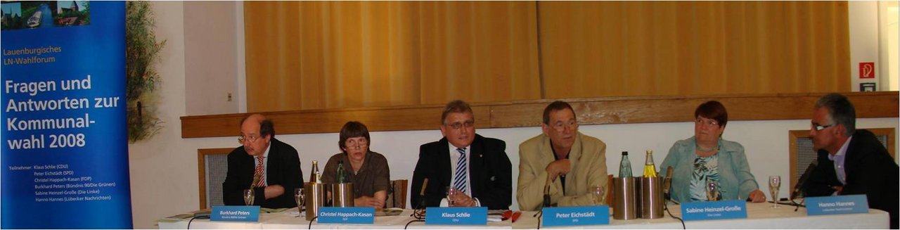 Die Kreisvorsitzenden der fünf im Bundestag vertretenen Parteien wurden von der Lokalredaktion der Lübecker Nachrichten zur Wahl befragt. Streitthemen waren vorwiegend die wirtschaftliche Entwicklung, die Kürzungen im Sozialbereich und die Kulturförderung. Bei allen Themen sah sich die CDU harter Kritik ausgesetzt. CDU-Kreisvorsitzender Klaus Schlie räumte ein, dass die CDU die absolute Mehrheit nicht halten wird. Burkhard Peters stellte für die Grünen die Programmpunkte Umwelt, Klima und Energie, Soziales und Finanzen sowie Bildung und Jugendförderung dar.