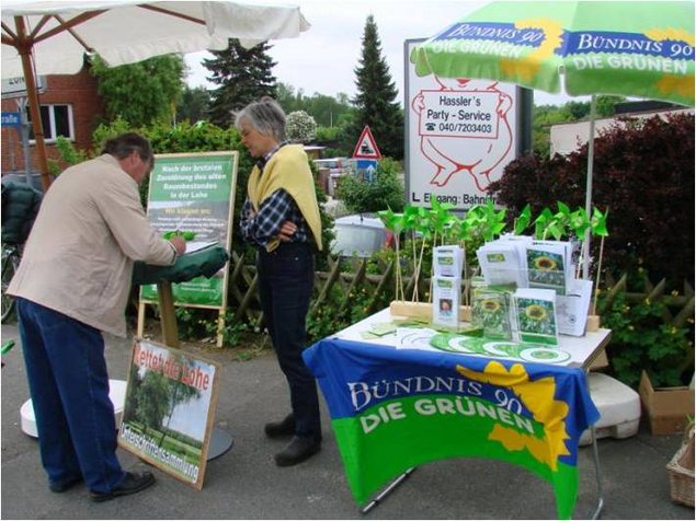 Nach der erfolgreichen Gründung bzw. Wiederbelebung von vier Ortsverbänden im letzten Jahr galt unser letztes Augenmerk vor der Kommunalwahl dem Sachsenwald. Unser erstes Treffen im März in Aumühle zeigte ein reges Interesse, allerdings vorwiegend von den anderen Parteien. Bei dem zweiten Treffen am 19. Mai im Hotel Waldesruh am See in Aumühle war es interner, immerhin waren sechs Personen mit Interesse an Grüner Politik erschienen und nur ein Vertreter einer anderen Partei. Wichtigste Themen in den Sachsenwaldgemeinden sind zur Zeit die Lohe, die Schulpolitik und die Bebauungspläne auf Waldflächen. Ein weiteres Treffen wurde für Ende Juni veranschlagt. Dazu ist geplant, einen Referenten zum Thema "Folgekosten von Baugebieten auf bisher nicht erschlossenen Flächen" zu gewinnen.