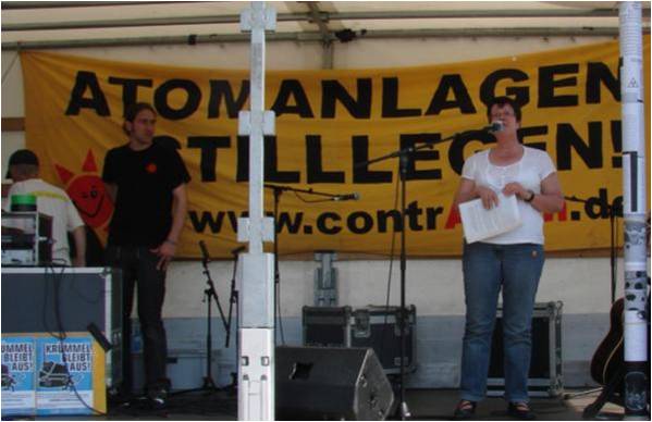 Im Anschluss ging es mit dem Fahrrad nach Krümmel zu einem Pressetermin vordem Atomkraftwerk. Dort traf sie u. a. auf die Elterninitiative Geesthacht. Diese trug ihre Sorgen über die Ergebnisse der Kinderkrebsstudie vor. Deren Hauptaussage: Im Umkreis aller AKWs gibt es eine erhöhte Zahl von Leukämievorkommen. Am 4. Juni soll im AKW eine Veranstaltung mit dem Leiter des Kinderkrebsregisters, Dr. Kaatsch, stattfinden. Man befürchte, dass dieser den Zusammenhang zwischen dem AKW und den Leukämieerkrankungen herunterspielen werde. Thematisiert wurde aber auch die beabsichtigte Wiederanschaltung des AKW – von Vattenfall für Juni 2009 angekündigt. Wegen des ständigen Zubaus regenerativer Stromerzeuger würde aber Atomkraft nicht mehr benötigt.