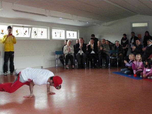 Im Anschluss besuchte er den Treffpunkt Moorring (ToM) in Lauenburg und traf da auf Lauenburgs Bürgermeister Thiede. Er kam mit Jugendlichen und den Betreuerinnen ins Gespräch und informierte sich über die Arbeit im ToM, ein Projekt des Diakonischen Werkes in Kooperation mit der Stadt Lauenburg. Ziel ist die Förderung und Unterstützung von Kindern und Jugendlichen im Alter von 6-14 Jahren und ihren Familien. Schwerpunkte am ToM sind Gruppenarbeit, Aktionsprogramme, Hausaufgabenhilfe, allgemeine soziale Beratung und ein Nachbarschaftscafé. Zum Abschluss gab es noch eine Aufführung der G-Breaker.