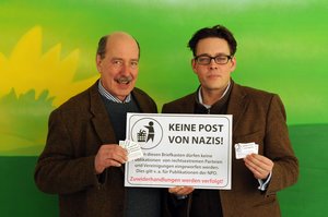 Aus Anlass der Aktivitäten Rechtsradikaler mit der Verteilung von Progagandamaterial in private Briefkästen haben die Kreisgrünen einen Aufkleber gestaltet, den sich alle ähnlich denkenden Bürgerinnen und Bürger an Ihre Briefkästen kleben können. Dieser fordert die NPD und andere rechtsextreme Parteien und Vereinigungen dazu auf, das Einwerfen sämtlicher ihrer Publikationen zu unterlassen. Bei Zuwiderhandlungen können sich die Betroffenen rechtlich zu Wehr setzten.