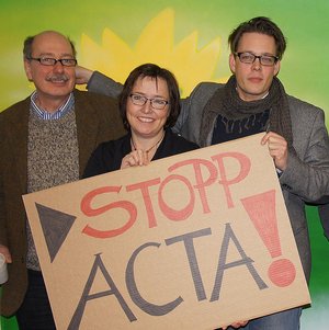 Das ACTA-Abkommen (Anti-Counterfeiting Trade Agreement) soll dabei helfen, Produkt- und Markenpiraterie zu bekämpfen, damit Plagiate nicht hochwertige Markenprodukte verdrängen. Die vorgelegte Form schränkt allerdings die Informationsfreiheit stark ein. Die GRÜNEN lehnen das ACTA-Abkommen ab, weil es für Intransparenz und mögliche Strafverschärfungen bei Urheberrechtsverletzungen im Internet steht. Außerdem wird mit ACTA der Zugang zu Generika - günstige, aber wirkungsgleiche Medikamente - in Entwicklungsländern gefährdet. Im Bild Burkhard Peters (Direktkandidat Wahlkreis 34, Lauenburg-Nord), Eka von Kalben (Landesvorsitzende) und Konstantin von Notz (MdB) demonstrieren für den Stopp von ACTA bei der Aktion in der Kreisgeschäftsstelle vor dem Neujahrsempfang.