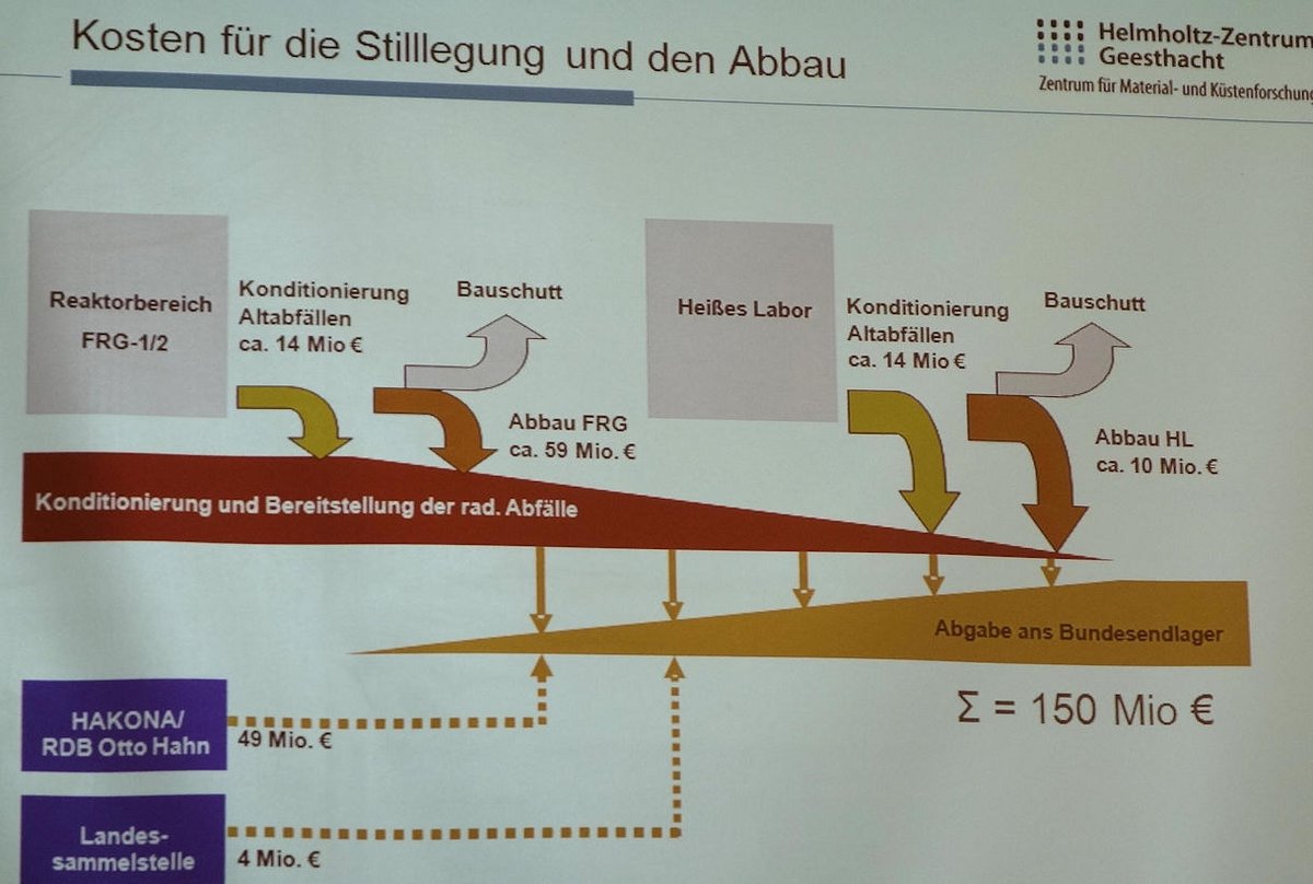 Auf der Übersichtskarte des Helmholtz-Zentrums (HZG) in Geesthacht ist das Gebäude des ehemaligen Forschungsreaktors immer noch ein markanter Punkt. Inzwischen ist der Reaktor stillgelegt, die Brennstäbe außer Orts verfrachtet. Doch die schwerste Aufgabe steht noch bevor: der Rück- bzw. Abbau. Auf einer Abendveranstaltung informierte die Geschäftsführung des HZG die interessierte Bevölkerung über den Stand der Planung. Demnach ist noch nicht endgültig klar, ob der sofortige Abbau bzw. ein sicherer Einschluss beantragt werden soll. Obwohl die Leistung des Reaktors mit 10 Megawatt weniger als ein Hundertstel des AKW Krümmel betragen hatte, liegt das Strahlungspotential immer noch bei 1,5 mal 10 hoch 15 Becquerel, was laut Vergleich des Fachreferenten der aktuellen Strahlungsmenge des Lagers Asse entspricht. Weil das Endlager für nicht strahlungsintensive atomare Abfälle, Schacht Konrad bei Salzgitter, kaum vor 2020 zur Verfügung steht, bedeutet dies für das HZG die Notwendigkeit, ein Zwischenlager zu errichten. Die Gesamtkosten für den Abbau würden sich geschätzt auf 150 Millionen Euro belaufen. Wie man sieht, war auch dieser Reaktor mit all seinen Nebenwirkungen über die letzten Jahrzehnte, kein Spielzeug, eher ein zusätzlicher hochkostenintensiver Baustein des atomaren Wahnsinns einer am industriellen Konsum orientierten Gesellschaft. Allerdings wurde dies in der Öffentlichkeit vorher kaum so wahrgenommen.
