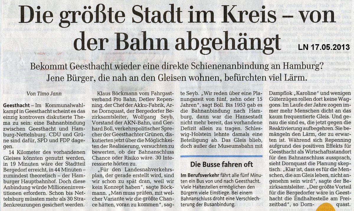 Am Mittwoch hatten die Geesthachter Grünen zu einer Podiumsdiskussion zum Thema „Bahnanbindung für Geesthacht“ ins Krügersche Haus eingeladen. Auf dem Podium saßen Dr. Detlev Repenning (ECC Geesthacht), Klaus Böckmann (Fahrgastverband ProBahn), Arne Dornquast (Bezirksamtsleiter Bergedorf), Wolfgang Seyb (Vorstand AKN Eisenbahn AG) und für die Grünen der Vorsitzende des Energieausschusses Gerhard Boll. Moderiert wurde der Abend vom Fraktionsvorsitzenden der Grünen Geesthacht Ali Demirhan. In ersten Statements signalisierten alle Podiumsgäste, dass sie für eine Bahnanbindung sind oder zumindest nicht dagegen. Auch das Publikum war ganz überwiegend dafür. Die Fragen betrafen hauptsächlich die Lärmbelästigung und damit verbunden die möglichen Modelle. Die günstigste Variante wären Dieseltriebwagen, die allerdings am lautesten wären. Sehr leise, aber auch wesentlich teurer wäre eine Stadtbahn. Hybridfahrzeuge sind heute noch Zukunftsmusik. Als weiteres Problem wurde die Verkehrsführung mit den vielen Straßenquerungen gesehen. Dazu wurden interessante Fotos „Geesthacht damals“ präsentiert, die zeigten, dass es die Bahnverbindung bis zum Hamburger Hauptbahnhof in der Vergangenheit schon einmal gab.
